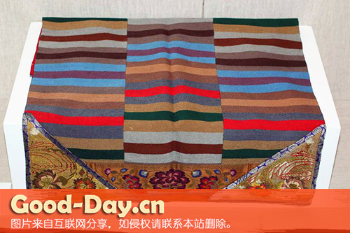 氆氇为藏族人民以手工制作,细密平整,质软光滑,作为衣料或装饰的优质毛纺织品,是以西宁羊毛为原料,经纺纱、染色、织造、整理等工序制成。