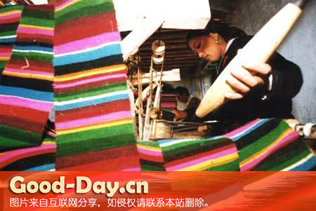 二、将羊毛用纺车纺成线,再用梯形木结构织机纺织。织氆氇用的是老式木棱织机,织好以后是白色的,宽24厘米左右,可以作男式服装。但一般都要染成黑色,也有染成红、绿等色彩。因氆氇是羊毛织品,结实耐用,保暖性好,所以很深受广大群众喜爱。它用于制作衣服和坐垫,有不同粗细等10多个品种,手工生产一般用纺锤捻线,织机织造,宽约40厘米。毛线用茜草、大黄、荞麦和核桃皮等做染料,可染成赭红、黄、绿等颜色。